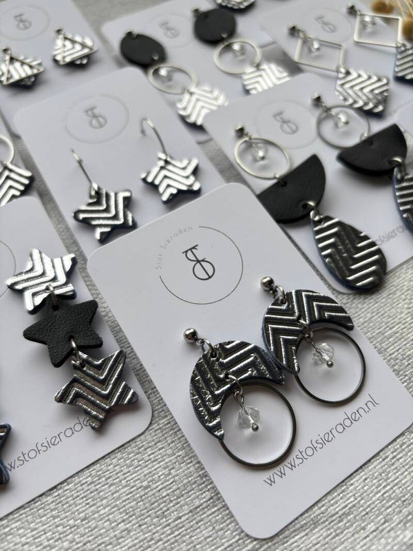 De Metallic Maze leren oorbellen collectie combineert diep zwart met zilveren accenten in een dynamisch zigzagpatroon. De strakke lijnen en metallic details creëren een speelse, maar stoere look met een moderne twist. Een perfecte balans tussen contrast en structuur, voor wie houdt van een gedurfde stijl. ⚫🔲