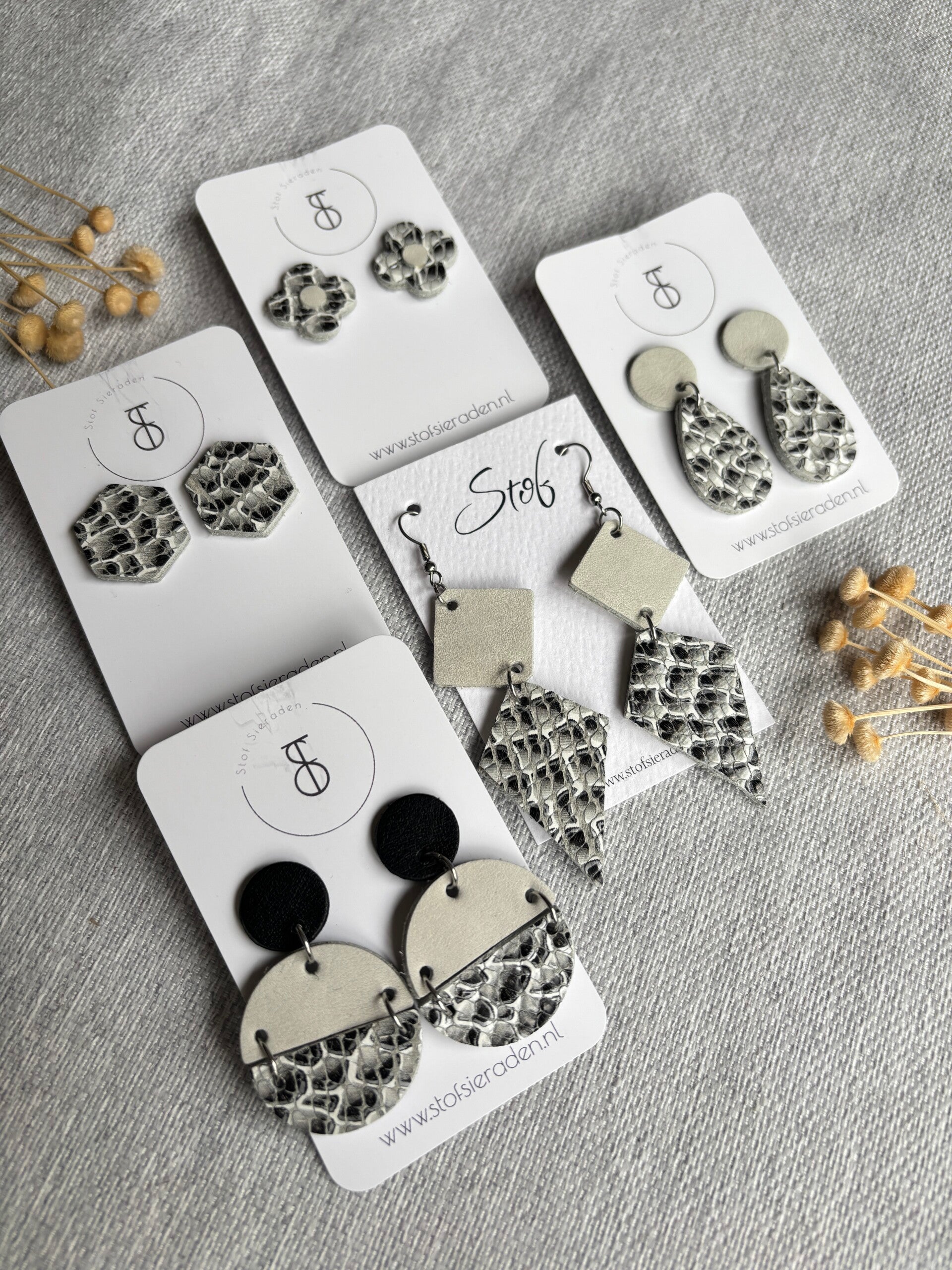 De Cobra Charcoal leren oorbellen collectie combineert de krachtige uitstraling van een slangenprint met diepe grijstinten, voor een stoere en elegante look. 🐍⚫