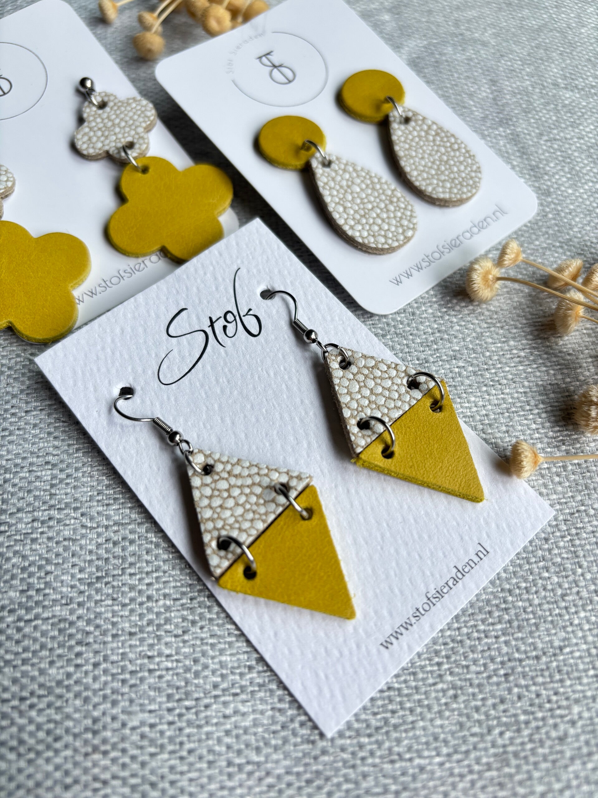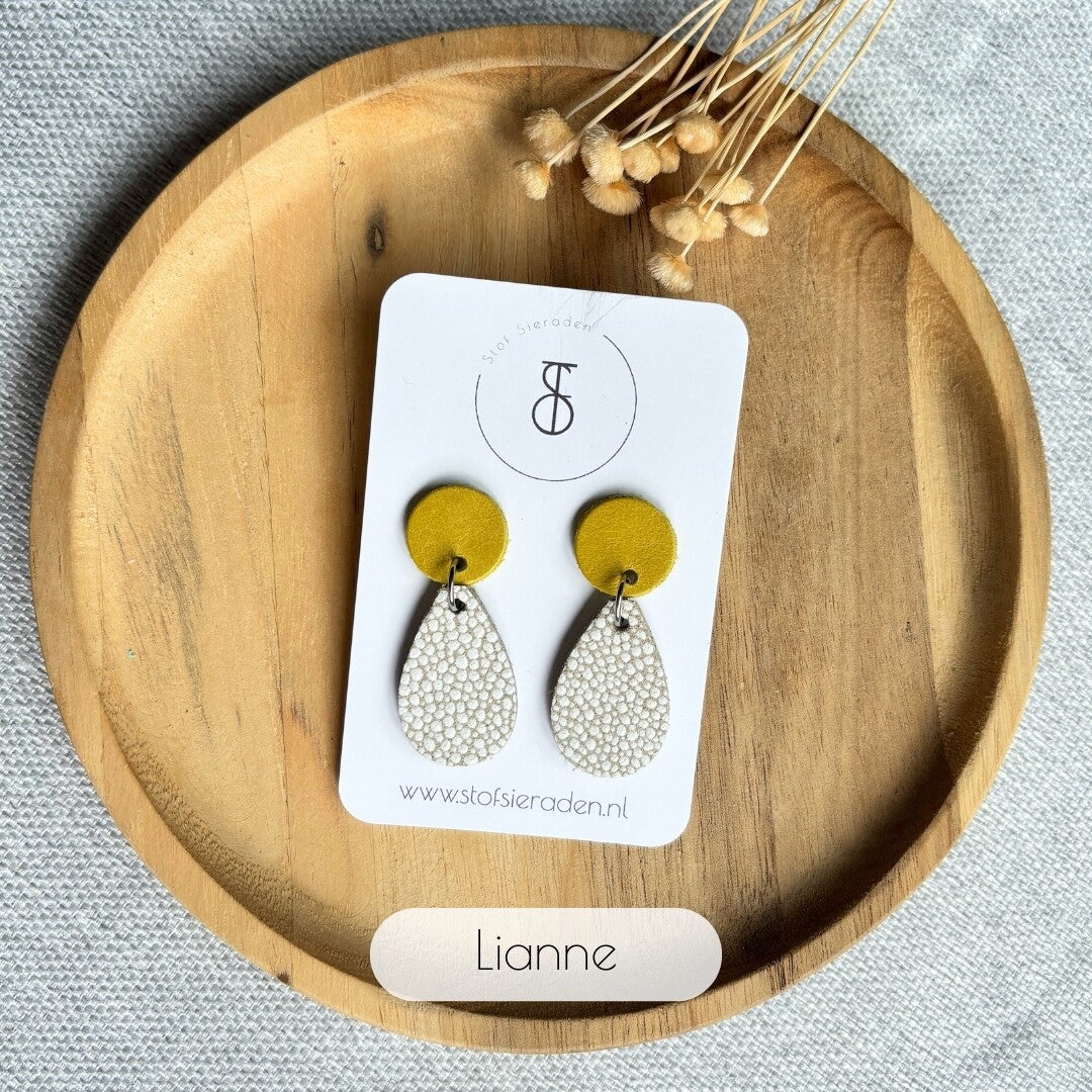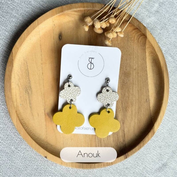 De Sunflower Dots leren oorbellen collectie combineert het vrolijke geel met de zachte stippelcreme, geïnspireerd door de warme stralen van de zon en de speelse charme van stipjes. Een frisse, levendige look die je meteen een zonnig gevoel geeft! 🌻✨